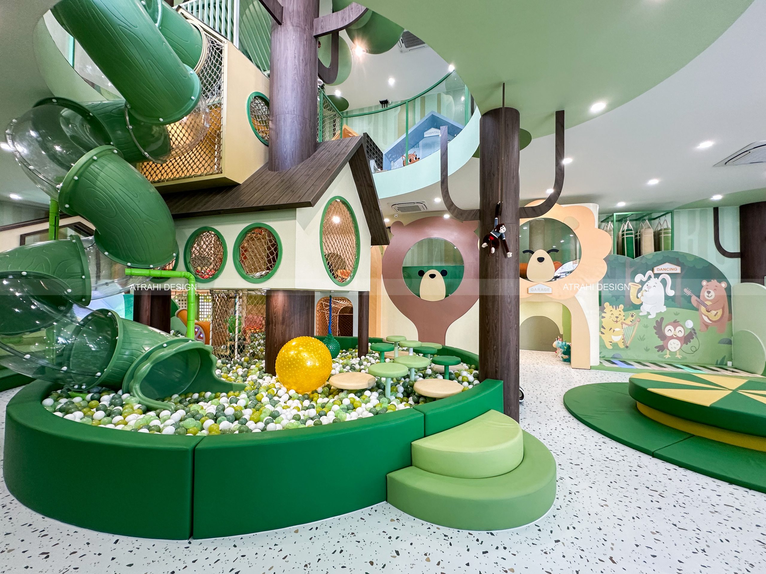 Không gian sử dụng tông xanh lá và nâu chủ đạo, điểm xuyết các gam màu thiên nhiên tạo cảm giác tươi mát, gần gũi. Hệ thống trò chơi vận động – giáo dục được bố trí như một “mê cung rừng xanh”, khơi gợi sự khám phá và tinh thần mạo hiểm của trẻ. Khu vực cà phê thoáng mát, có tầm nhìn bao quát toàn bộ khu vui chơi, tạo thành điểm nhấn đặc biệt của dự án