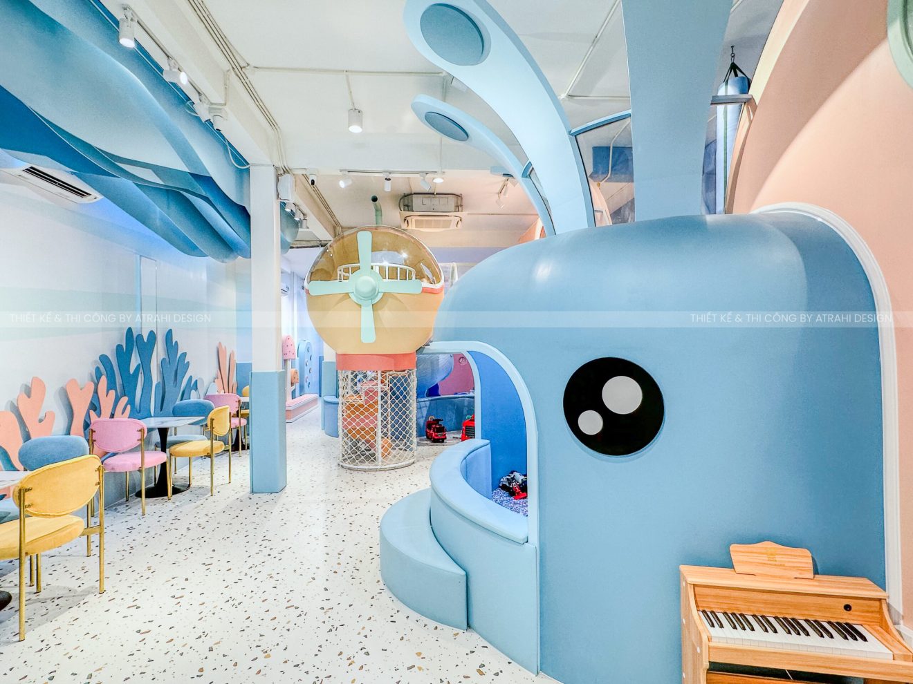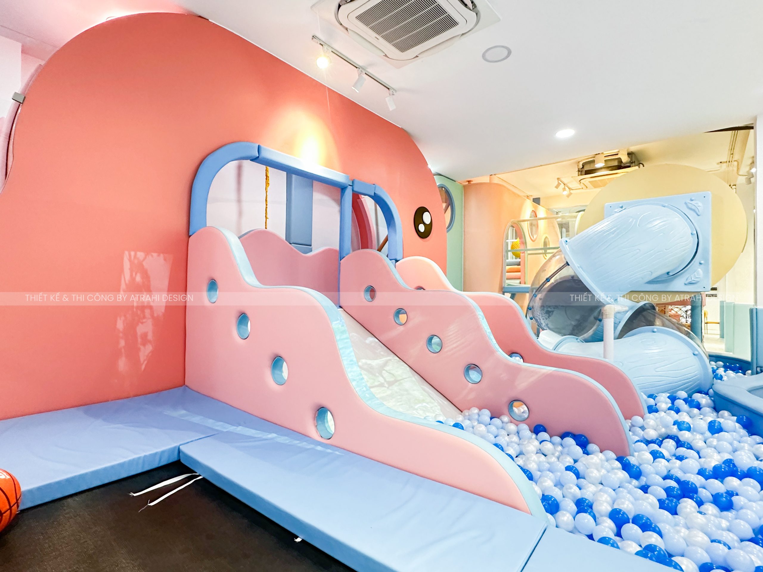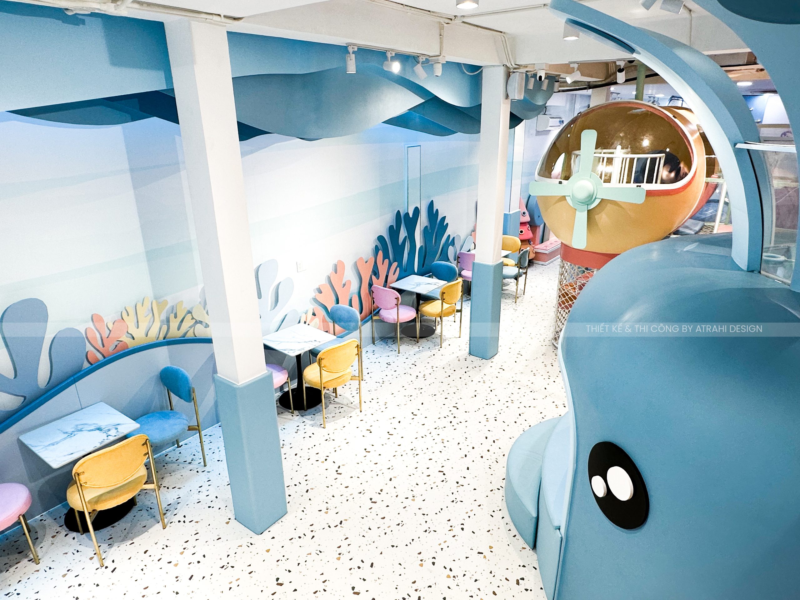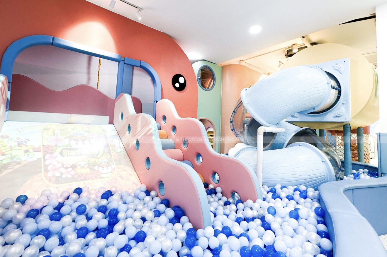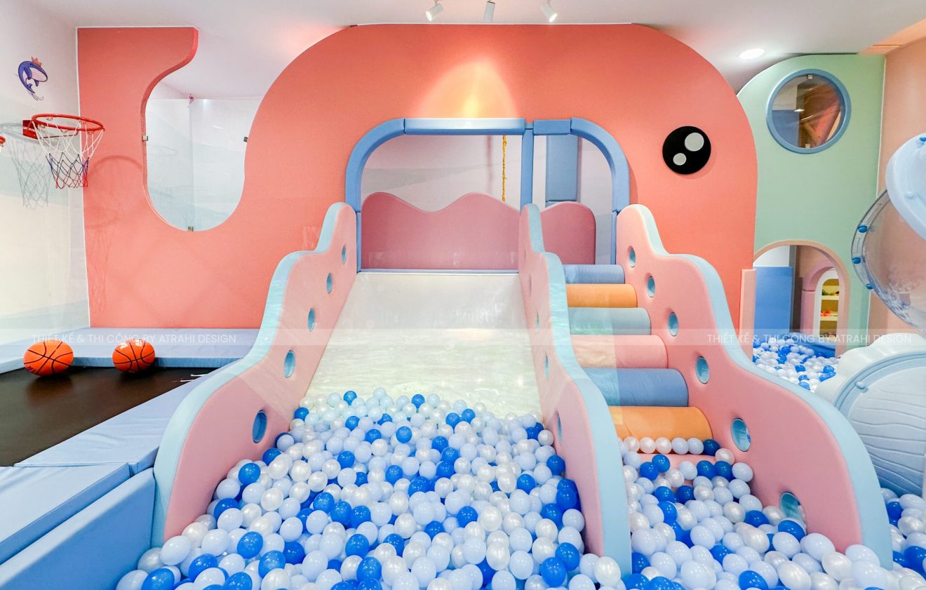 Dự án TiGold Kids Cafe là minh chứng rõ nét cho khả năng thiết kế chuyên nghiệp và sáng tạo của Atrahi Design trong mảng quán cà phê kết hợp khu vui chơi trẻ em. Với diện tích rộng 200 m² tại vị trí chiến lược ở Quận Gò Vấp, không gian được biến hóa thành một “đại dương thu nhỏ” đầy màu sắc — sử dụng tông xanh dương và cam, kết hợp họa tiết san hô — tạo nên trải nghiệm sống động, hấp dẫn cho trẻ em. Các chủ đầu tư muốn tìm hiểu thêm về các mô hình khác của Atrahi có thể liên hệ với chúng tôi qua Hotline: 0909 728 761 để được tư vấn cũng như khái quát về chi phí thiết kế khu vui chơi 🌿.